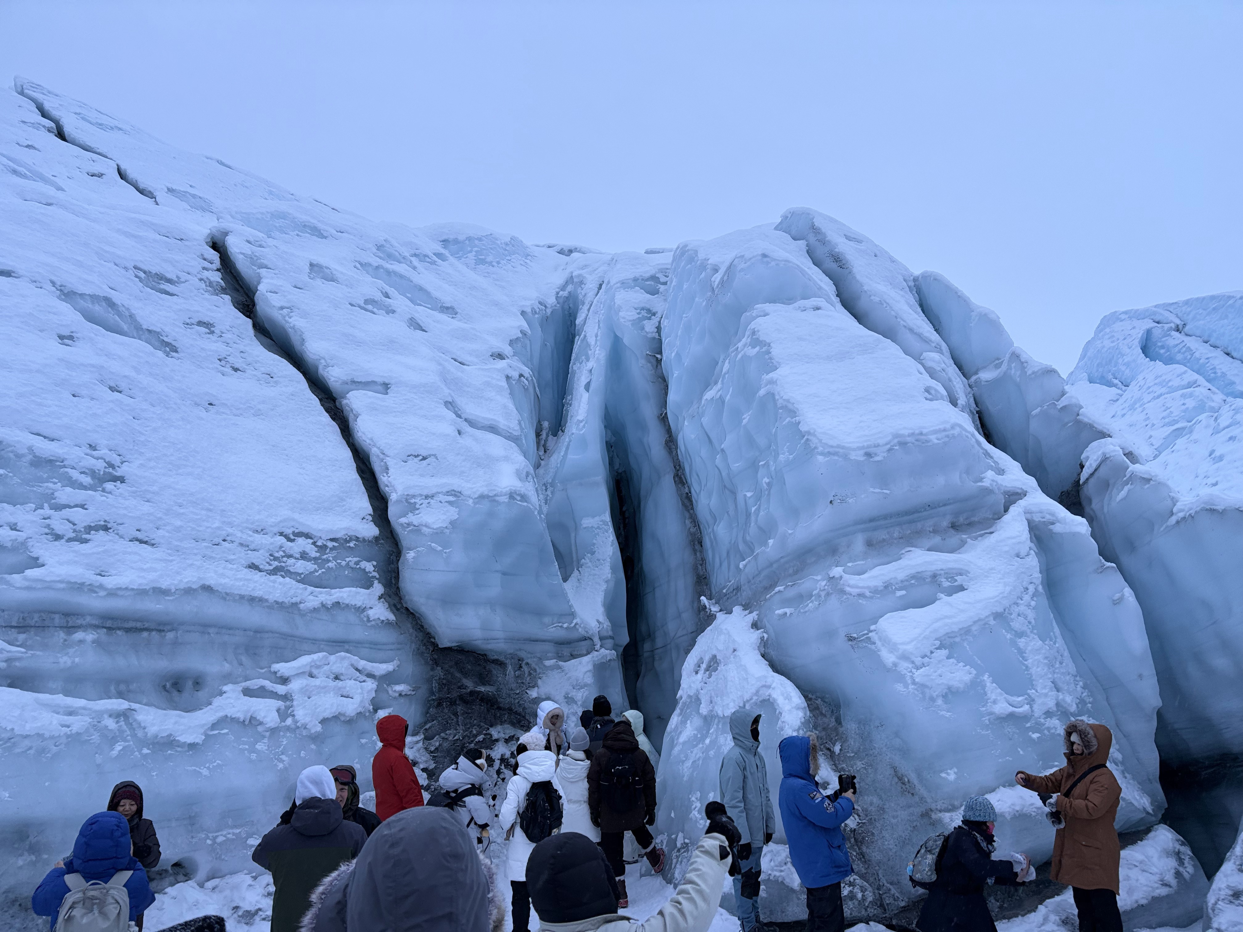 经过两个多小时的车程,我们终于到达了马塔努斯卡冰川。中间还换了辆面包车,把我们送到一栋小屋,在那里穿上了冰爪,然后乘坐雪地摩托抵达冰川底部。从这里开始徒步。听说夏天的时候游客只能步行到那里,不能坐雪橇。我在这里烤火的时候还没想到之后会冻得多惨。