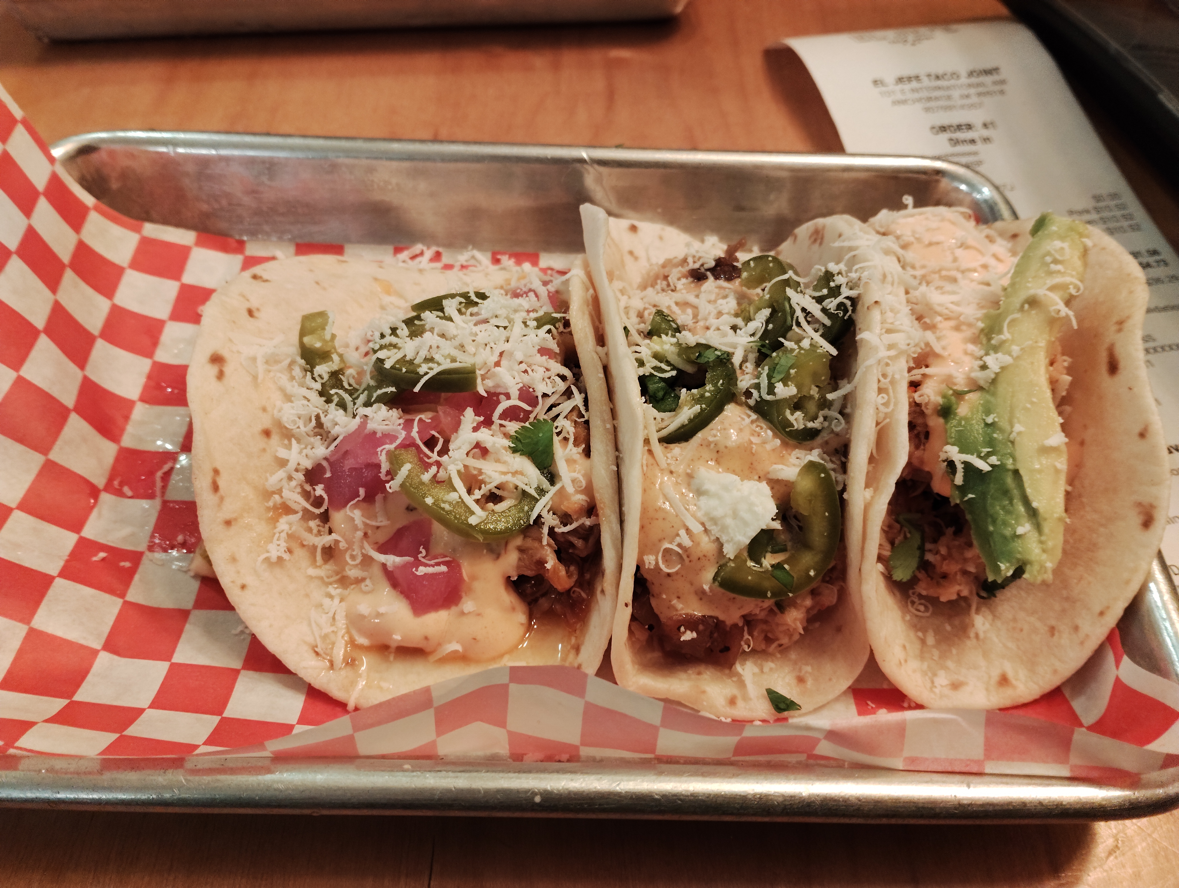 晚上出来填肚子去的 Taco 店,不知道为啥要给座位系皮带。 Taco 本身倒是没啥问题,点了两个鸡肉的一个猪肉的,我没吃出来哪个是哪个。店员小姐姐倒是挺有意思的,打出来的发票里收银员名字是 Jayceeeeeeeeeee…(略)。