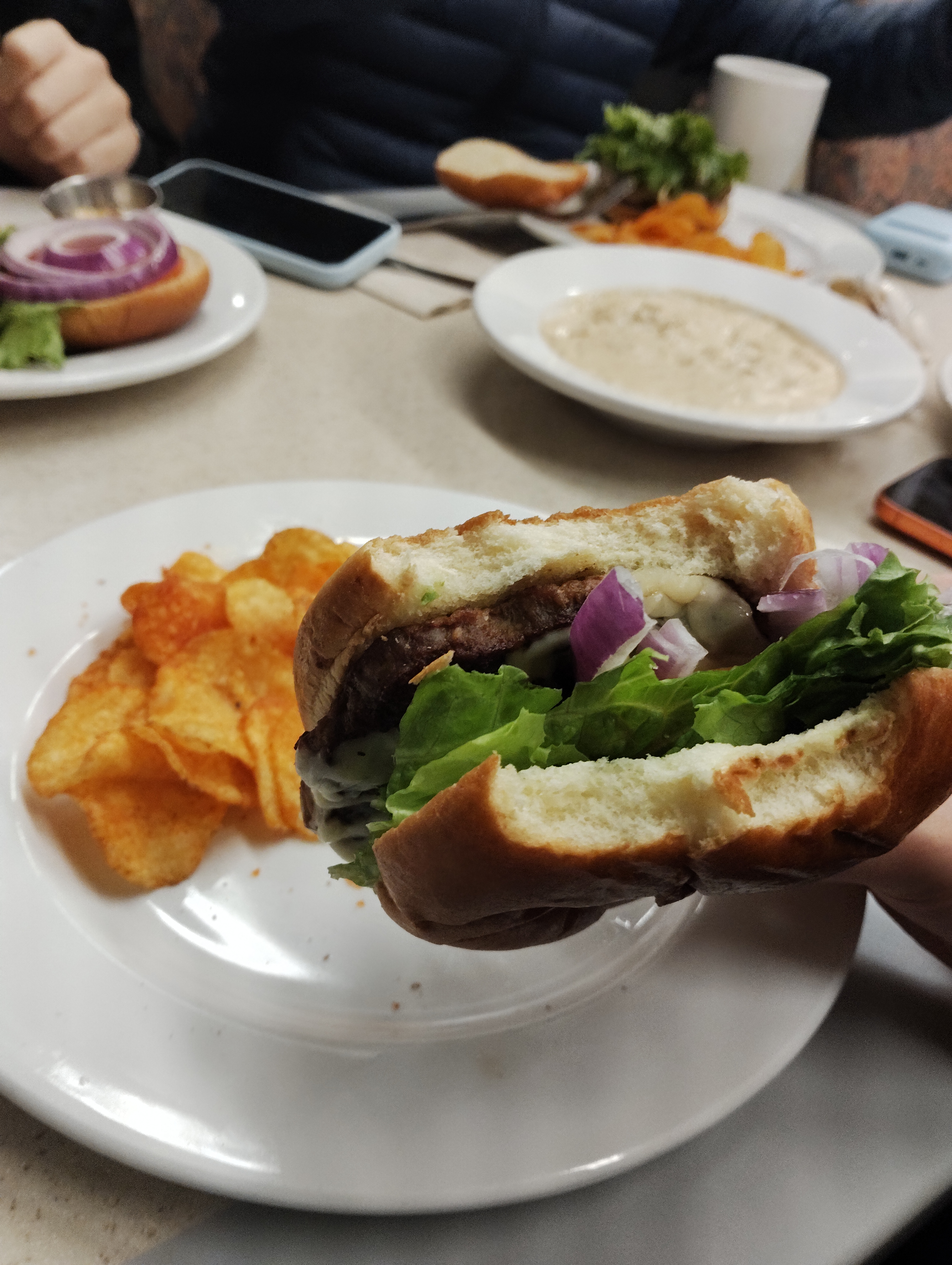 火车上吃的晚餐。我倒不是特别喜欢肉饼。我更比较喜欢牛肉的口感,把它打成肉泥,是对辛辛苦苦长出这些纤维的牛的亵渎。薯片倒是味道不错。背景里的 chowder,因为同行的同学往里撒了致死量的胡椒粉,就留给他吃了,我没有碰。