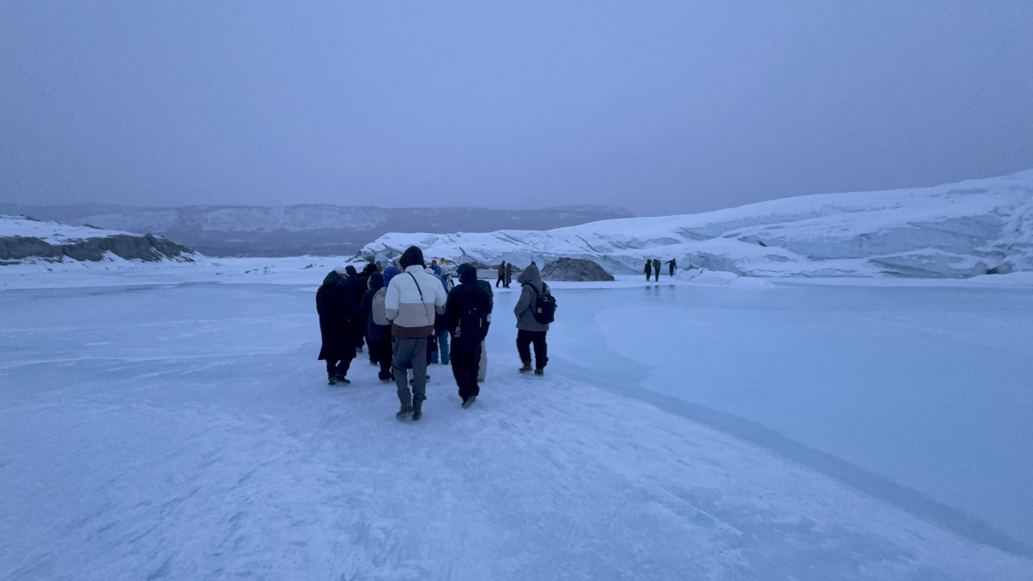 经过两个多小时的车程,我们终于到达了马塔努斯卡冰川。中间还换了辆面包车,把我们送到一栋小屋,在那里穿上了冰爪,然后乘坐雪地摩托抵达冰川底部。从这里开始徒步。听说夏天的时候游客只能步行到那里,不能坐雪橇。我在这里烤火的时候还没想到之后会冻得多惨。