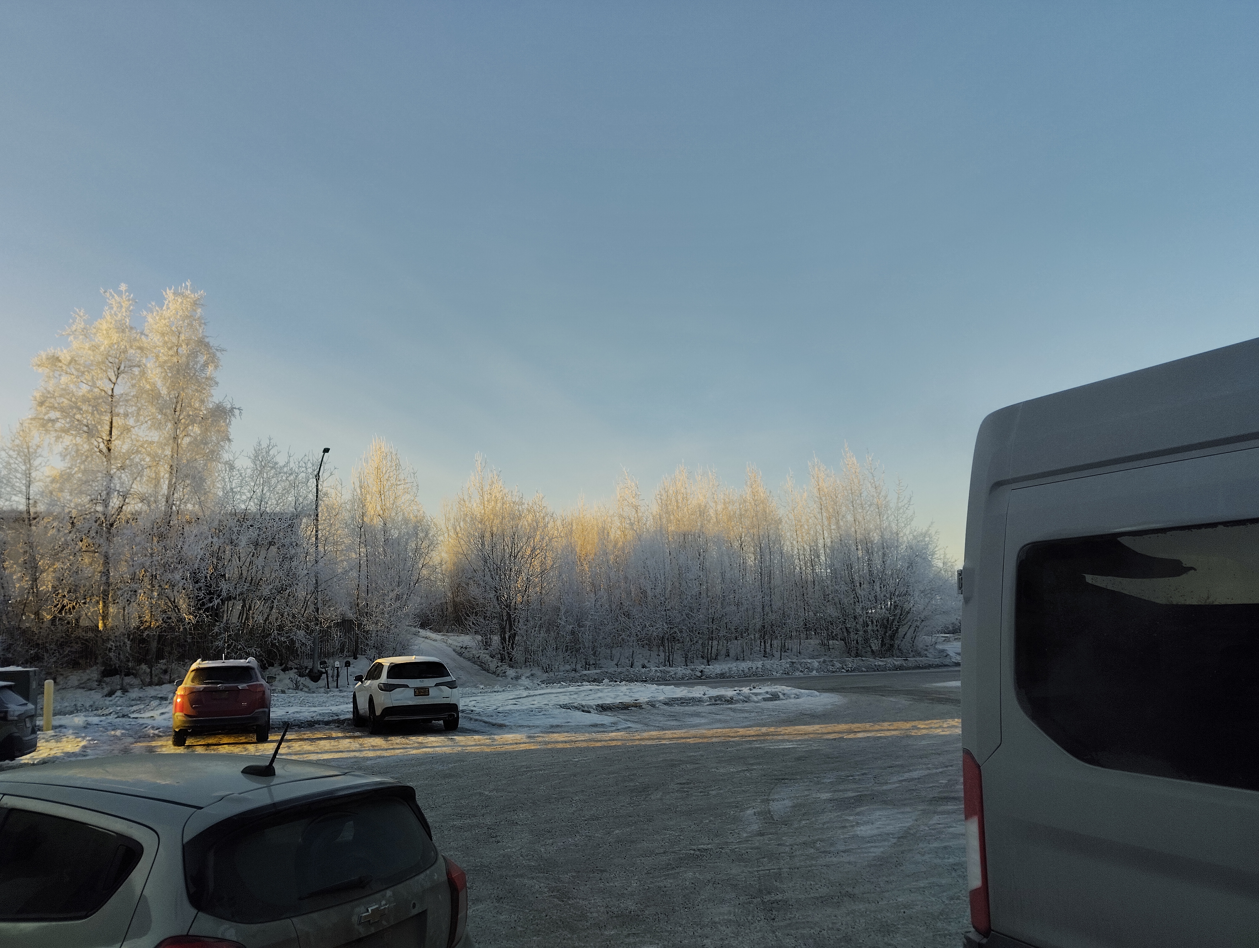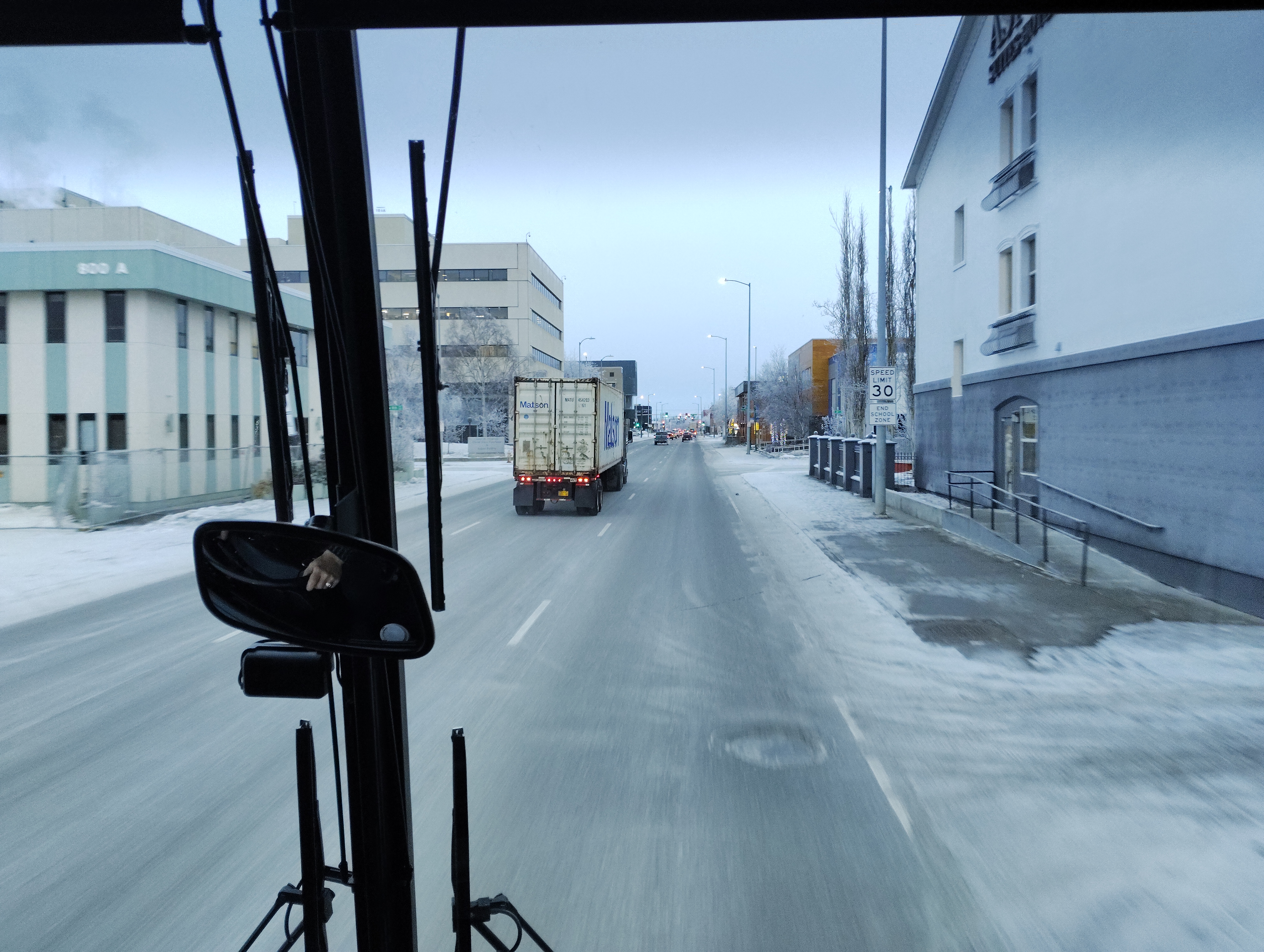 路途中,John 给我们介绍了在阿拉斯加能看到的动物们。居高临下地伫立于树顶,却是垃圾场的常客;远看上去像一个黑色方块的白头鹰。越往北越危险的熊。他提到他家被熊闯入过一次,不过欲知具体如何,且听下回分解,他说。