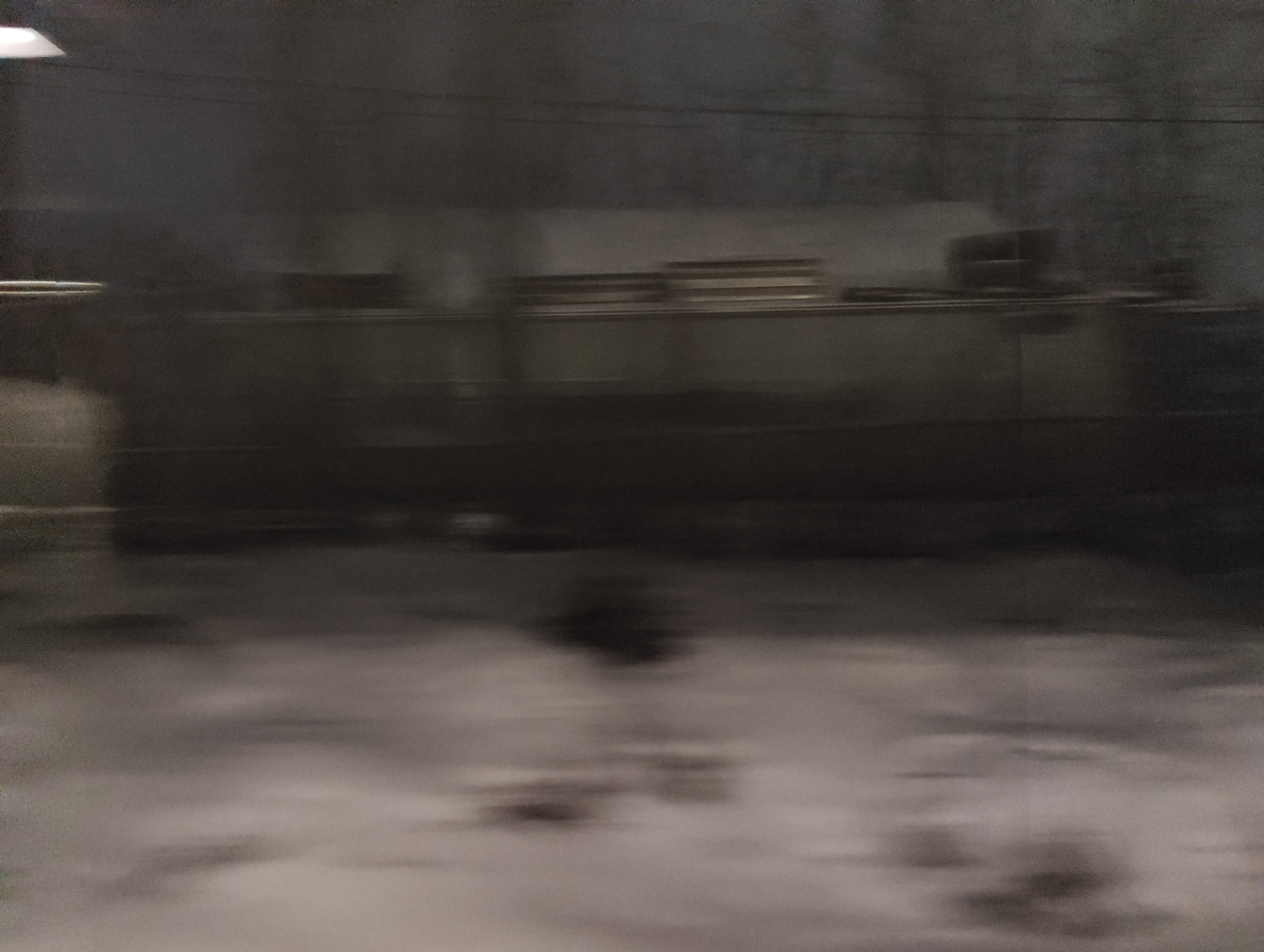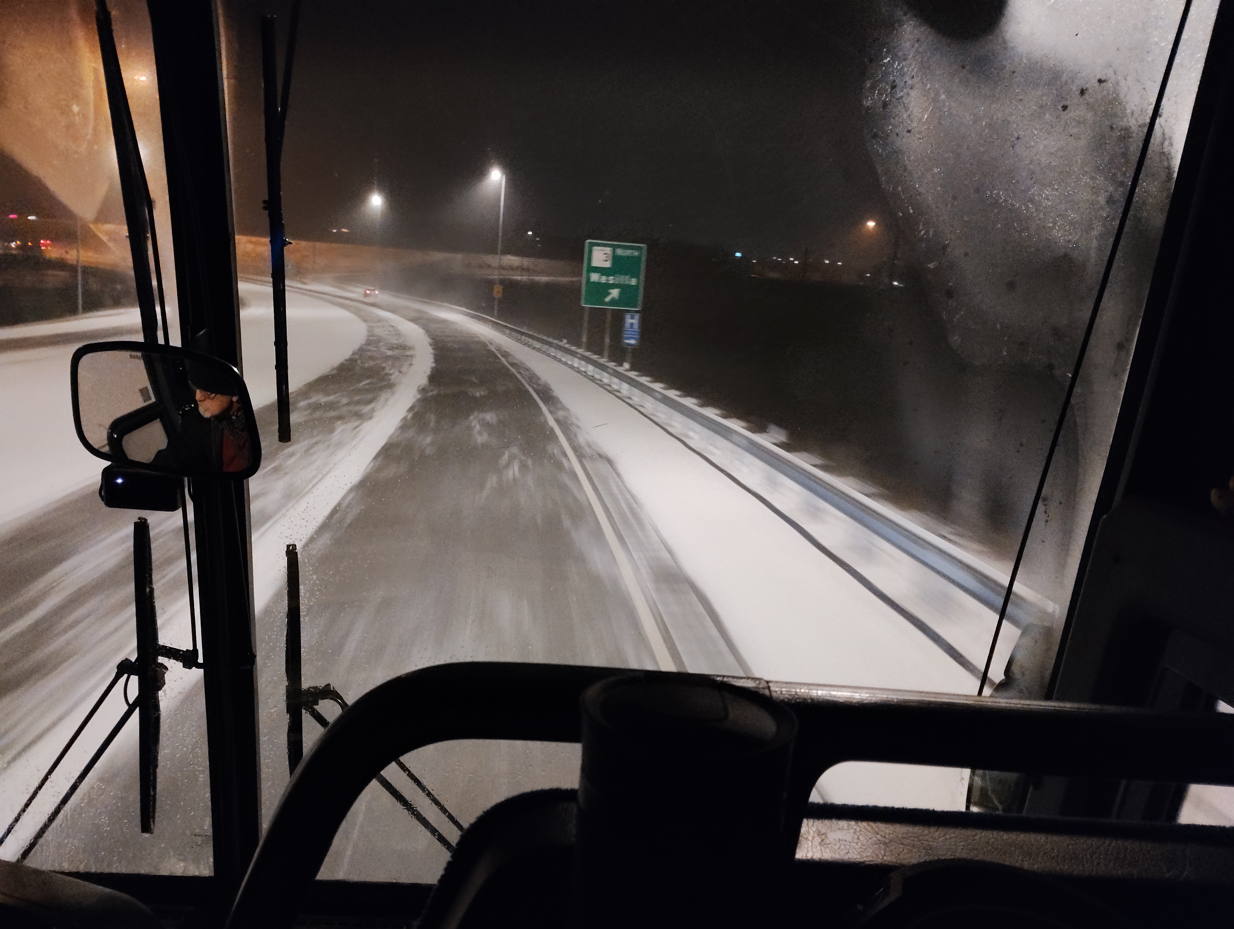 回酒店的路上,路上的雪像沙子一样,在风中来回飘扬。 又有些雪聚集在一起,在公路上画出凝固的浪花。而我们仿佛在黑蒙蒙的大海中航行。远处的灯光就像灯塔,为我们指引着海岸。 我低头看着那些“浪花”,尝试着辨认它们的形状。有的是怪兽,有的是猴子的爪子,有时候还像一只鸟。 John 忘了讲他关于熊闯入家中的故事,我也忘了问他。