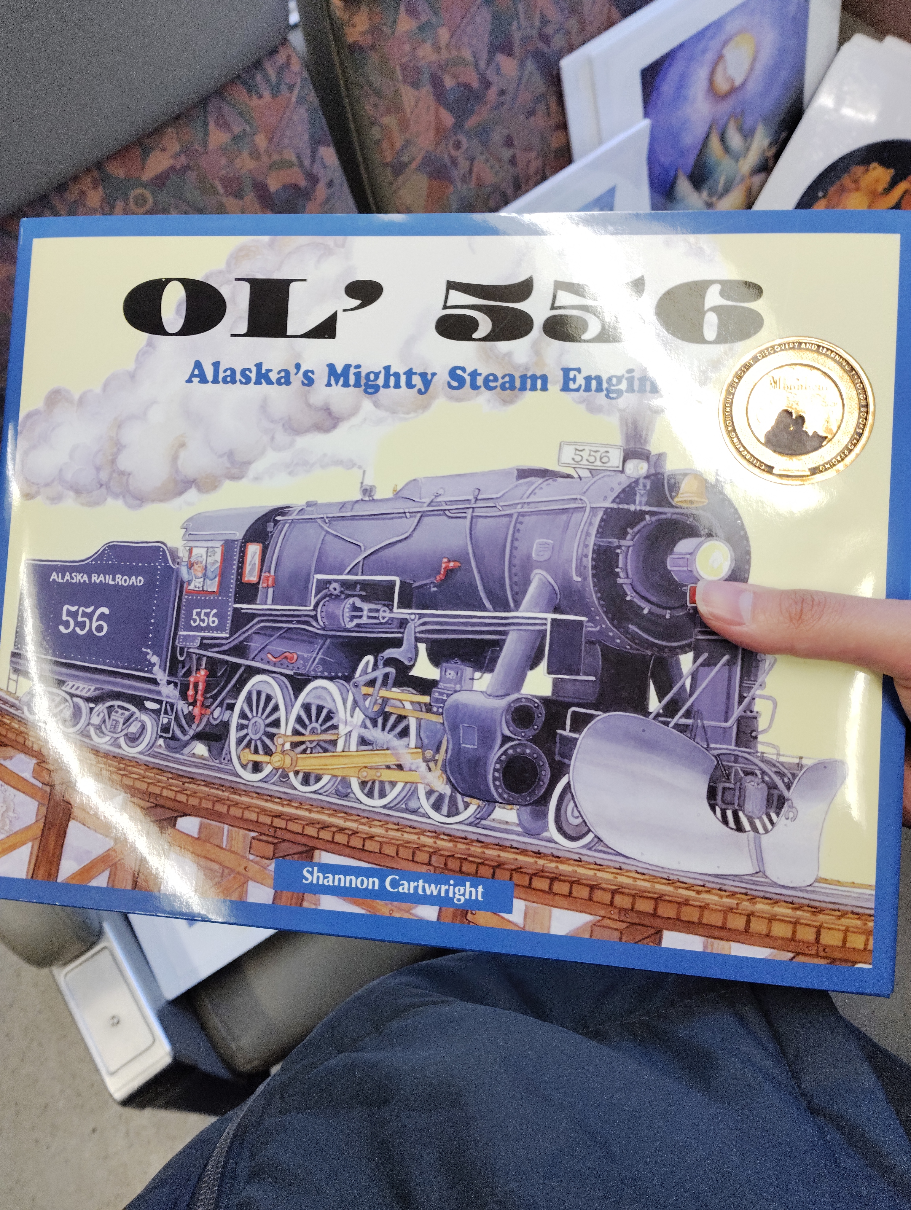 在车上买的绘本。作者的 Shannon 也是住在这条铁路沿线的一座小屋,这次她也上了车。我读了她的另一本绘本,用 Twelve Days of Christmas 的格式讲了阿拉斯加的各种动物,从最开始的树上的一头黑熊,到最后的12只绵羊,都注解了他们的特点。感觉仿佛回到了童年,挺有意思的。我真真切切感受到了Shannon对阿拉斯加的爱,所谓爱屋及乌,她甚至把阿拉斯加的蚊子都画进了歌谣里。